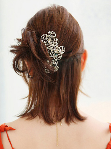 小ぶりのかんざしタイプのヘアアクセサリーは、髪の長さが短くてバックスタイルがさみしくなりがちな人にオススメです。シニヨンの周りにバランスよく配置してゴージャス感を演出します。