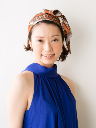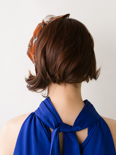 思い切って額を出し、ターバンでアクセントをつけたスタイルです。バックは、部分的にターバンの内側に折り込むことで、アシンメトリーに仕上げます。えりあしがすっきりするので、後ろから見てもエレガント!