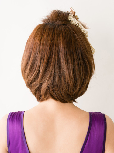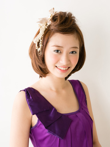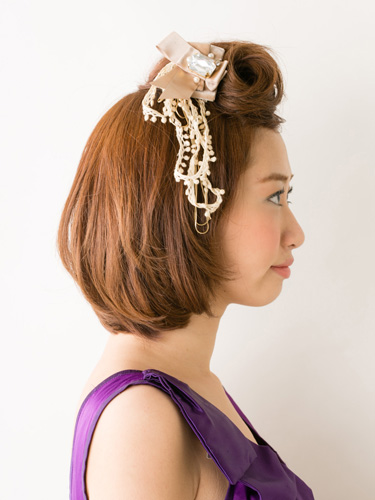 トップに丸いコロネのような立ち上がりをつけることで、ひと味違うアレンジに。逆毛を立てたトップの毛先を、丸めてピンで留めるだけなので、作るのも簡単です。ヘアアクセは長さのあるものを使うと、トップのボリュームに対して長短のバランスが取れるのでグッド。