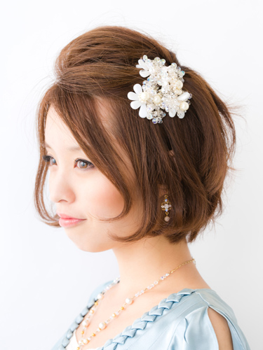 パールでつくった花がモチーフのUピンを3本重ねづけ。おだんごなどのアレンジで使えば1本でも華やかな仕上がりに。アレンジのボリュームによって重ねづけしても1本使いでも。