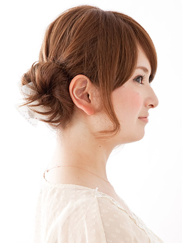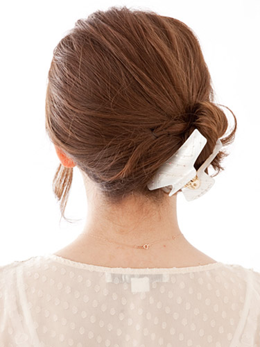 雨の日に髪をまとめたいけれど、野暮ったくなるのがイヤ。そんな方にオススメのさりげなくオシャレ感が漂うアレンジです。ストーンが輝くエレガントなホワイトクリップを使えば、同僚だけでなく上司受けも◎。低めの位置に毛束をねじってまとめ、ちょっぴり大人っぽい雰囲気に仕上げます。