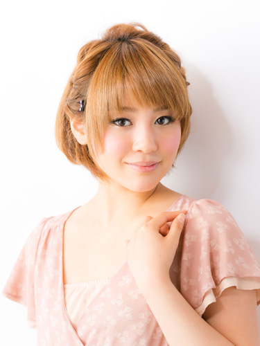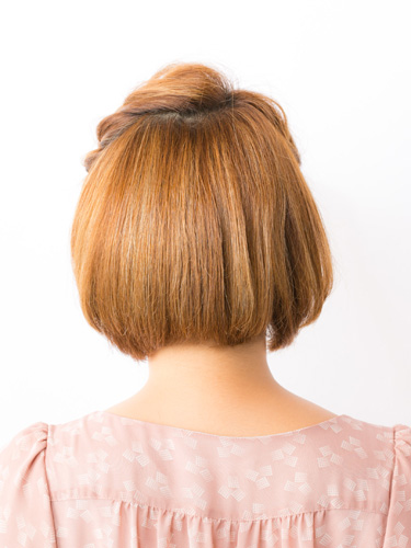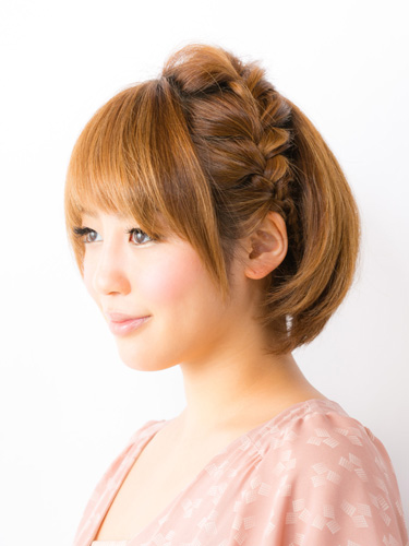 アシンメトリーなシルエットになるよう、髪のボリュームが多いサイドは編み込みも大きくざっくりと、逆側の少ない方はタイトに1回編み込んでいるのみ。ボリューム感と編み目で左右に変化をつけています。トップに編み目がくると、カチューシャをつけたような華やかさが出て、大人っぽく仕上がります。かわいくなりがちな編み込みも、高さとルーズな質感で大人の甘さを引き出して。