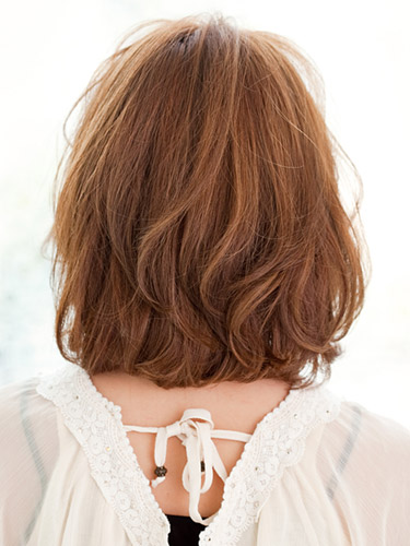 - 軽く内巻きになるまでハンドブローをした後、顔周りはアイロンで平巻きに巻きます。サイド&バックはフォワードとリバースを交互に巻き、ゆるやかなカールに。ソフトワックスを毛先にもみ込んで、束感と動きを出しながらフォルムを整えます。