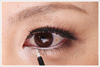 目頭にラメ入りリキッドアイシャドウを塗ります。こうすることで、白目がキレイに見え、瞳がうるうると輝きますよ。疲れて見える目元をパーティー仕様に復活させてくれる簡単ワザなので、アフター5メイクにも活用して!