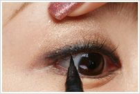 極細のリキッドライナーで、まつげの間を埋めるようにもう一度ラインを引きます。ダブルラインで、さらに目の際がはっきりと際立ち目が大きく見えます。ラインと言っても横に引くのではなく、まつ毛とまつ毛の間の点を埋めるような気持ちで描いていきましょう。