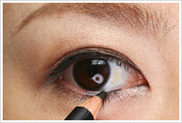 目の印象をさらに強く見せるため、黒目の下の粘膜部分にペンシルアイライナーで隠しラインを引きます。このひと手間で黒目の印象がぐっと強くなりますよ。