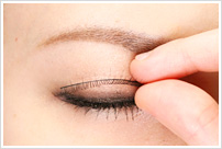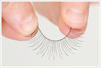 ピンセットでつけまつげの中央をはさみ、まつげの生え際にそっとのせて、中央→目尻→目頭の順に軽く合わせていきます。その後、軽く合わせた状態のつけまつげを、ピンセットで優しく押さえて固定します。こうすることでつけまつげが取れにくくなります。