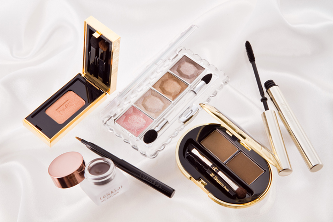 4つの色と輝きで、きらめきに満ちた目元を作るアイカラー。モデルカットでは左端のピンクを使用。キラキラとまたたくグリッターが、深い輝きをプラス。