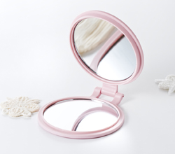 約10倍の拡大鏡と通常の鏡がセットされたコンパクト型ミラー。手になじむ大きさといい、感触といい、ベスト! 色はピンクと白の2種類です。メイクの細かい部分をチェックしたり、毛穴開きや、肌のキメなど、肌の状態を確認したりするのに便利。好きな角度で自立するのもグッド!