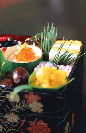 おせち料理のお重には、一の重(口取りといわれるオードブル。甘い味付けが中心)、二の重(酢の物が中心)、三の重(煮物と焼き物が中心)の構成が基本です。