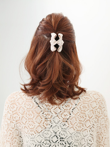 ベージュに白いステッチが入っていて、シンプルだけどエレガントさも感じるクリップ。挟むだけで簡単に留まるクリップは、手元にゴムが無くてもすぐにアレンジができるので1つバックに忍ばせておくと便利なアイテムです。