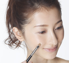 パフでルースパウダーを塗布して定着させる - ルースパウダーをパフに取り、しっかり押さえるようにつける。粉の効果で肌に定着させるので、カバー力がアップする。