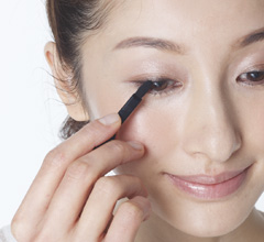 同系のアイカラーでフィックス - アイラインと同系のパウダーアイシャドウを、小さめのブラシかチップにとり、1で描いたラインをぼかすように色をのせる。
