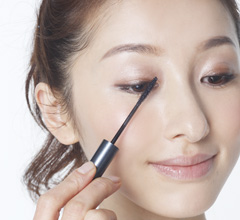 まつ毛の中央を強調してマスカラをつける - ビューラーでまつ毛をしっかりと根元からあげてから、マスカラをつける。中央は左右にギザギザと動かしながら、目頭側は鼻すじに向かって斜め45度に、目尻側は眉尻に向かって流すように。中央にしっかりつけるのがポイント。