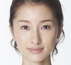 BBクリームを5点置きしてのばす - 色ムラが出にくいBBクリームをセレクト。手のひらにパール粒大とり、両頬、おでこ・鼻・あごに5点置きし、全体にスキンケアクリームをつけるようにざっと塗る。目の下や小鼻などヨレやすいところは中指で押さえるように。