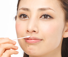 ラメの範囲が広すぎると、不自然になってしまうので、山になった唇のフチを軽くなぞればOK。先の細い綿棒を使うと、きれいに仕上がります。
