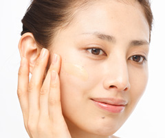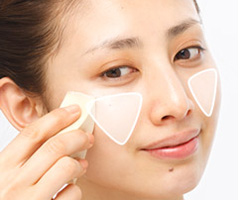 薄づきファンデで、ベースの光を透けさせる - 1で塗ったベースが、少し透けるくらいの薄づきファンデーションを、顔の内側から外側に向かって広げます。カバー力重視の物だと、ベースの光効果が薄れてしまうので注意。