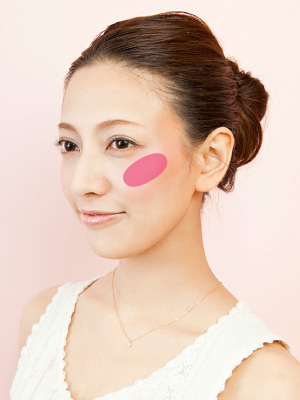 まず、チークをたっぷり筆に含ませた後、手の甲またはティッシュで余分な粉を落として粉の量を調整します。その後、小鼻から、耳のつけ根の上部とこめかみの間を目指して、シャープな楕円を描くように筆を動かします。