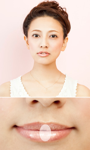 グロスを唇全体にぼてっと塗らずに、写真のように上下中央にだけ塗ると、立体的な唇に見せることができます。グロスは、小さなラメが入っているものを選ぶと、さらに立体的に見えますよ。