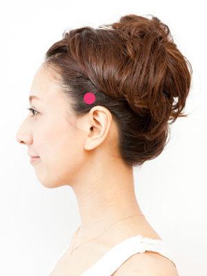私のおすすめは、耳の上とこめかみの間の“曲鬢(きょくびん)”というツボ。ここをグーッと押すことによって血行がよくなり、むくみが解消されることによって小顔効果が得られます。
