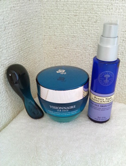 ひとつ目は、ランコムの「ヴィジョネア ポリッシングクリーム」です。専用のポリッシャーがついていて、毎晩“肌磨き”ができる優れもの。クリームを顔全体にのばした後、ポリッシャーのつるつるした滑らかな面を肌にあてて、磨くように動かします。リンパを流すように顔の中心から外側に向かって流していくのがポイント。そして、週2回のケアとして、ポリッシャーの粒状の面を使って、古い角質を取り除くようにクルクルと動かします。潤いはもちろんですが、しわ、くすみ、毛穴といったエイジングケアもできますよ。