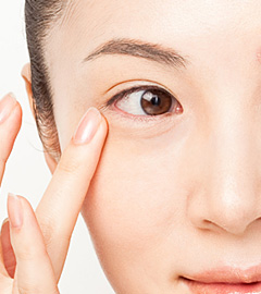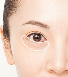 目頭部分は特に黒クマになりやすい! - 下まぶたの目頭から目尻に向かって、黒クマができている部分すべてに塗る。とくに、目頭側のくぼみ(へこんでいる部分)は影になりやすいので、丁寧にカバー。