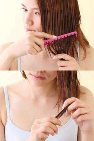 コームでとかした後に、毛先を指ではさんで下方向にすべらせて、さらに集中的になじませて。ダメージが大きい毛先のパサつきをケアします。