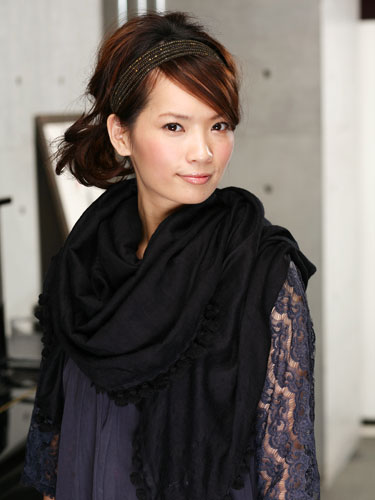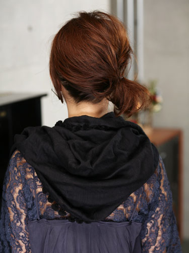 ダークカラーのストールは重い印象になりがちなので、襟足と顔まわりがすっきりしたアレンジがおすすめ。ボブスタイルはひとつに結ぶだけだと後れ毛が出て しまいがちですが、そんな時に役立つのがターバン。すっきりとまとめられます。ターバンが苦手な人は、全体をラフに遊ばせてカチューシャをつけてもおしゃれな印象に。