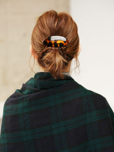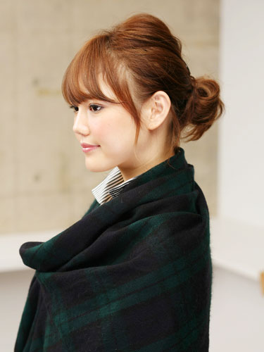 大判のストールを広げて纏い、ブローチなどで留めると清楚な雰囲気に。そのスタイルと好バランスなのが、やや低めの位置でラフにおだんごをつくるヘアアレンジ。きりりと引き締まった印象をプラスできます。ざっくりとまとめてトップに高さを出すとさらにデキる女風に。