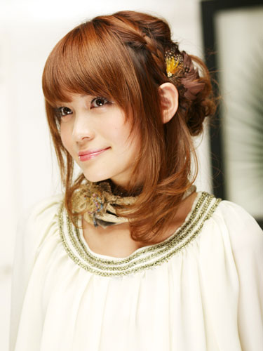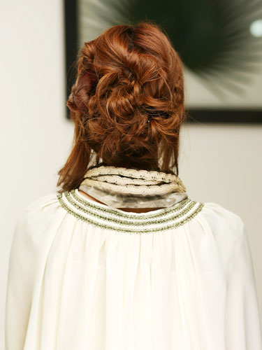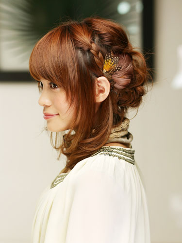 耳前、耳後ろを残して、トップ、ハチ回りの髪をブロッキング。残りの髪は左サイドでひとつにまとめてゴムで結びます。結んだ髪を4~6つの毛束に分け、それぞれをねじってランダムに留めていきます。ハチ回りの髪もねじってランダムに固定。トップの髪を下ろして、両サイドに三つ編みを作ったら、耳後ろにピンで固定します。
