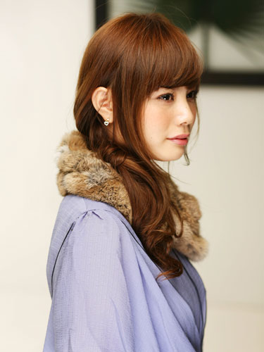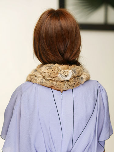 髪全体を片サイドに寄せたアレンジがファーマフラーを引き立てます。アレンジそのものは、ゆるく三つ編みをしているだけととても簡単。三つ編みのゆるさ加 減と顔まわりの髪の残し方で印象が変わります。全体に力が抜けた感じで仕上げると大人っぽく、余裕を感じさせるスタイルに。