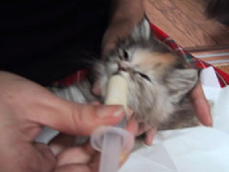 飲む力がない赤ちゃん猫は、1滴ずつ口の横から流し込んであげなければなりません。そして、できる限り早く獣医師に診せてください。少々乱暴な手ですが、注射器でお腹にブドウ糖を入れて脱水状態から回復させる方法もあります。