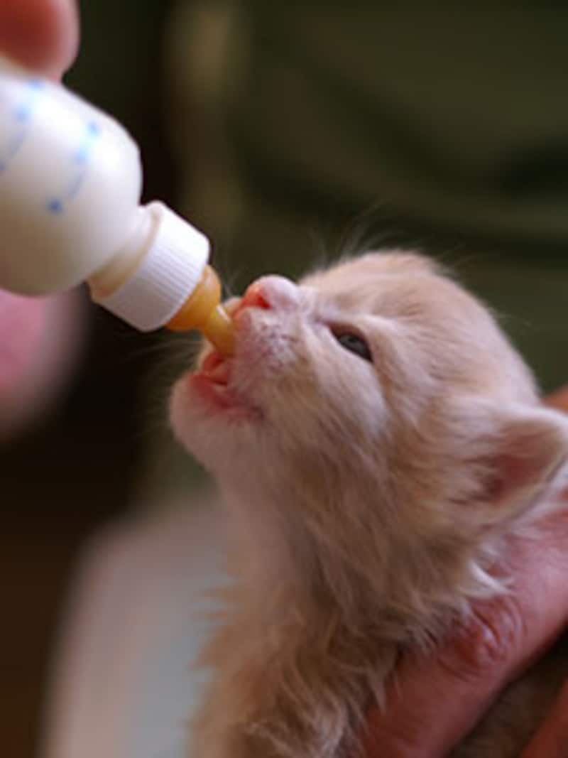 子猫には必ず猫専用のミルクを与えてください。もし子猫用のミルクが手に入らないときは、一時的にスキムミルク(コンビニでも買えます)で代用しても良いでしょう。猫は乳糖を分解する酵素を持っていないので、牛乳を与えると下痢をするかもしれませんので注意してください。