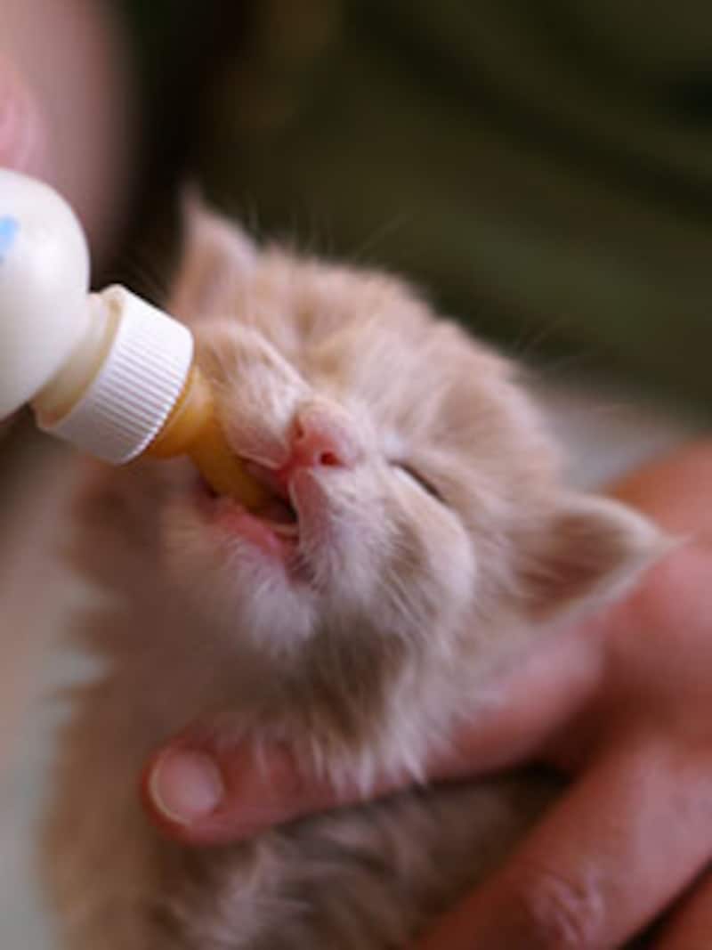 子猫用のミルクは数社から発売されています。それぞれ缶に子猫の月齢にあわせた溶かし方・与え方が指示されていますが、弱っている子猫は濃すぎると消化できないことがありますので、最初は少量ずつ回数を増やして与えて様子を確認してください。問題がなければ規定量、もしそれ以上欲しがったらウンチの様子と相談して増やしてください。ミルクを溶かす濃度も、規定通りだと下痢をしたり脱水を起こすことがありますので、様子を見ながら加減してください。