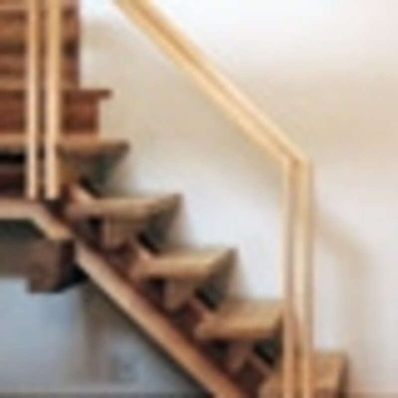 | 2. ファミリールームからロフトを見上げる。 3. ロフトにはカナダツガ材の梯子で上がる。 |