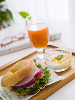 では、何を食べればいいの? 忙しい朝は、ベーカリーやコンビニを利用するのも手。次のものから2品くらいを食べるのがよいでしょう。「カフェオレ(でき ればホットで無糖)」「野菜ジュース」「フルーツ入りヨーグルト」「野菜サンド」「おにぎり」「シリアル+ミルク」「果物」( 具体的な摂り方はこちらをCheck )。