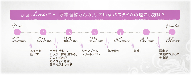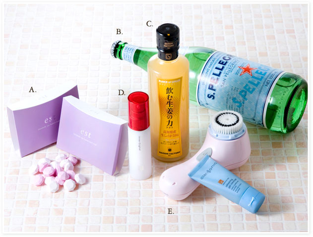 発汗を促すドリンクや入浴剤をはじめ、顔の汚れをしっかり落とす音波洗顔器、半身浴に欠かせないミネラルウォーターなど、塚本さんの美肌キープの礎となっているアイテムを紹介します。