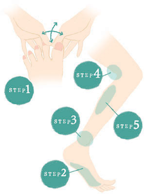 体が充分温まったら、いよいよマッサージを開始。最初は、手ではなく、電気やゲルマニウム系のローラーを使うと、短時間で血液がスムーズに流れるようになるので効率的です。ローラーは、足の甲や足の裏など、老廃物がたまりやすいところから使うのがポイント。いきなり、ふくらはぎをケアしても、老廃物はスムーズに流れません。続いて、手でマッサージ。まずは、脚の指を1本ずつ開いたり、指のつけ根を押して反らせたり、5本の指をしっかり開かせましょう。そして、足の甲→くるぶし周り→膝の裏→ふくらはぎの順にマッサージをします。