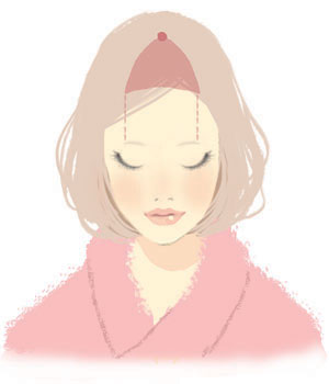 この三角の部分に頭皮用オイルを塗りこむ。頭のてっぺんと眉山の延長線上を結んだ、いわゆる前髪になる部分。