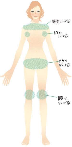 緑に色づいている箇所が、リンパが溜まりやすいところ。お湯につかりながらマッサージをして、体の巡りを改善して行きましょう。