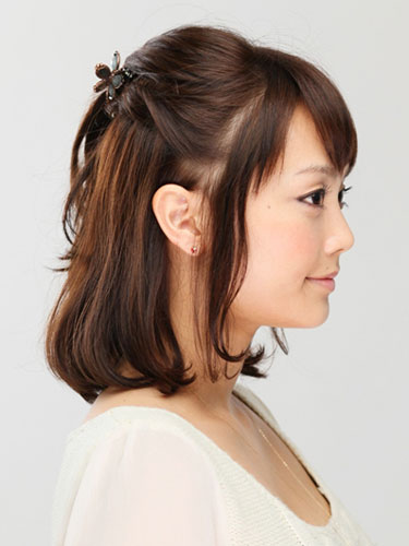 ポンパドールとサイドねじりはどちらも定番のヘアアレンジテクニック。その2つを組み合わせれば、ぐっと華やかな表情に! サイドをまとめると顔立ちがシャープに見えるので、オフィスにもぴったり。