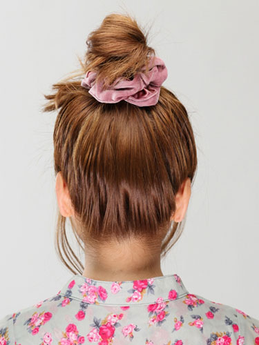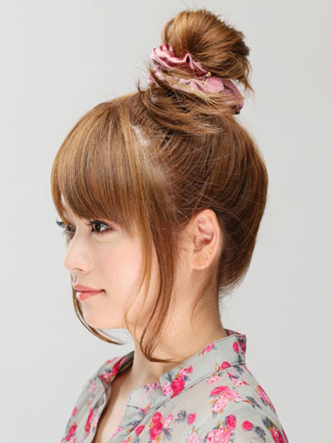 アクティブ気分の日はまとめ髪が最適。ポニーテールを人気のシュシュで巻きこむだけの1分間でできる簡単おだんごヘアアレンジ。ルーズに仕上げるほうがキュートに見えるのでぶきっちょさんでもOK。