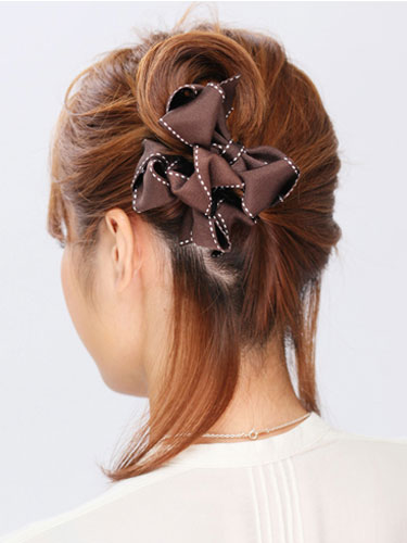 ブラウン×白のステッチがキュート&カジュアルな雰囲気を演出してくれるクリップ。リボンがバックサイドにもあしらわれているので、360度美しく仕上がります。大きめサイズなのでロングヘアの人でもしっかり留まるサイズです。