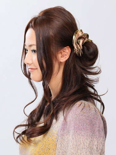 ルーズさが魅力のスタイルなので、しっかりゴムで結んでからシュシュを付けるのではなくシュシュのみで仕上げます。シニヨンの毛束を広げる時も左右均等を意識し過ぎずに、ふんわり感を大切にしましょう。
