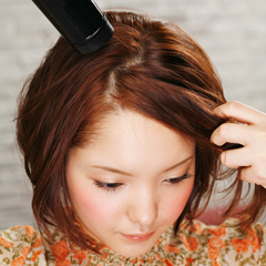 - 片サイドに髪を寄せるように髪をドライ。そのときに、髪を軽くひっぱりながら乾かして生えグセをなくします。