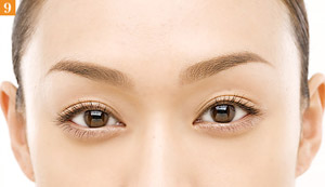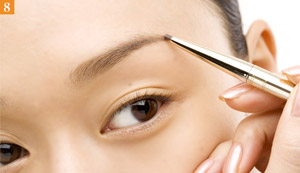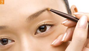 - パウダータイプだと細いラインが描きにくいので、眉尻はペンシルで描き足す。眉山あたりから自然に流すように描いて。
