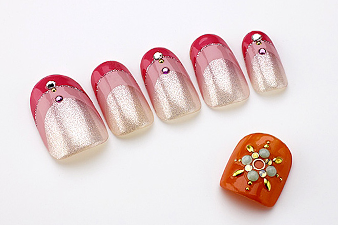 パールホワイトのベースに、コーラルピンクとオレンジでWフレンチを描きます。ビビッドなコーラルピンクは、ブラック系のファッションとの相性も抜群です。親指、中指、薬指にはクリアとピンクのストーンを飾り、より華やかに仕上げます。