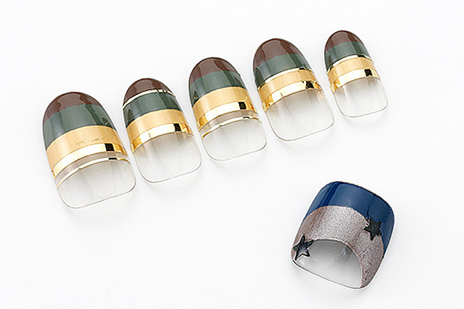 ポップな印象が強いボーダーを新鮮な表情に見せてくれるのは、ゴールド、スモーキーカーキ、ブラウンの組み合わせ。太&細のゴールドのテープでさらに輝きラインを加えて、オリジナリティ溢れるデザインの完成です。