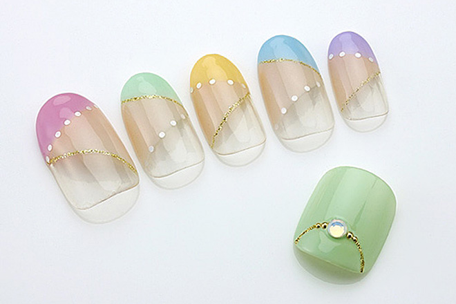 ピンク・ライムグリーン・イエロー・ブルー・パープルの5色使いでも、薄く淡いトーンの組み合わせならポップさを感じさせながら全体の印象は大人可愛く。ラメゴールドで引いたラインと、ライン状に並べたホログラムで引き締めます。