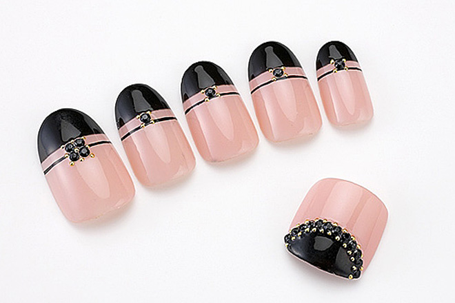 淡いピンクとブラックの組み合わせは、キュートでセクシーな小悪魔カラー。セパレートカラーの先端をブラックにしてブラックのストーンをラインの中央にあしらい、ゴールドのブリオンで縁取ります。華やかに仕上がり、アクセサリーいらずのデザインです。